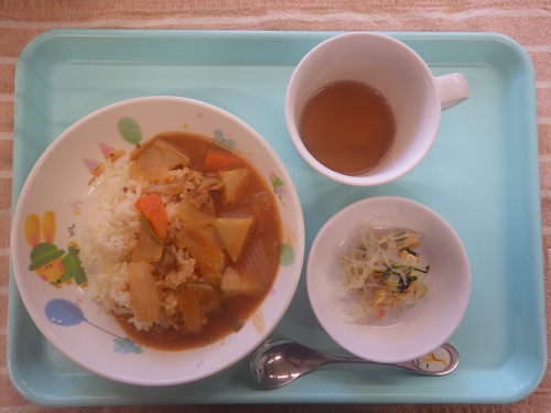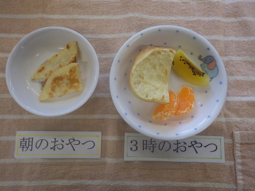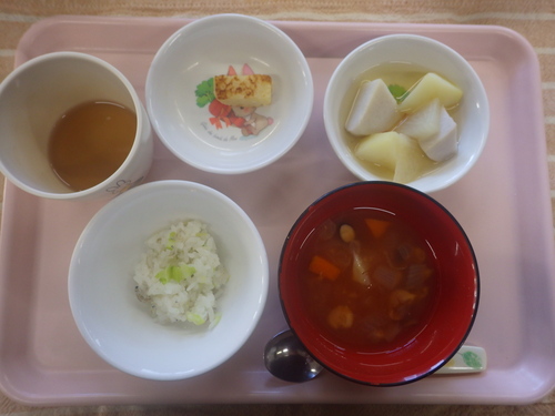 今日のメニューは 朝のおやつが、大根もち。 お昼のご飯が、赤米一分づきご飯 はやしシチュー・春雨中華風ごまサラダ。 3時のおやつが、はちみつパン・みかん(1階)キウイ(2階)。
