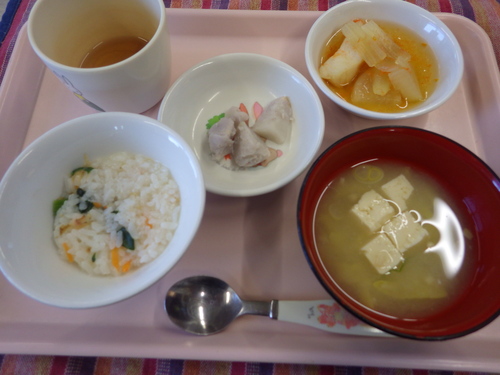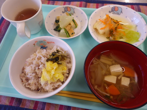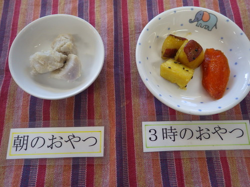 今日のメニューは・・・ 朝のおやつが、蒸し里芋。 お昼のご飯が、雑穀一分づきご飯 お魚の南蛮漬け・甘みそ和え・すまし汁。 3時のおやつが、オーブンで大学芋・干し柿。
