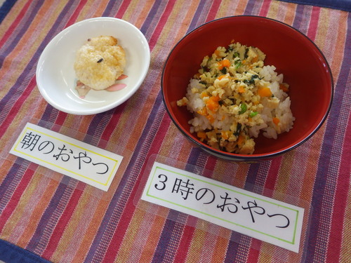 今日のメニューは・・・ 朝のおやつが、おやき。 お昼のごはんが、押麦六分づきご飯・筑前煮・りんごさらだ・大豆もやしのみそ汁。 3時のおやつが、三色丼。 今日は、筑前煮にれんこんやごぼうなど根菜類を入れ、 みそ汁に大豆もやしを入れました。 子どもたちの噛む練習になり、良かったです。 よく噛んで食べることが出来ていました。