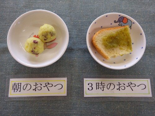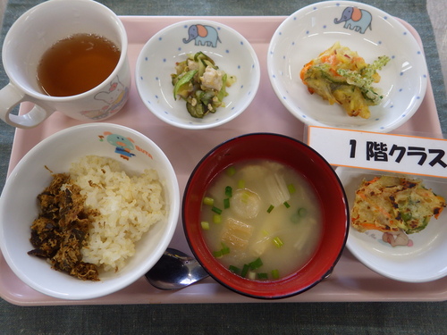 今日のメニューは・・・ 朝のおやつが、さつまいもボール。 お昼のご飯が、もち麦一分づきご飯 かき揚げ・さっぱりサラダ・お麩とえのきのみそ汁。 3時のおやつが、手作りパン(レモンの皮ジャム)。
