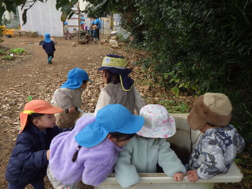 今日は畑にて過ごしましたよ。 畑に植えてあるスナップエンドウの成長を観察したり、どんぐりを拾って並べたり、 お姉さん達と遊んだりと時間いっぱい楽しんでいました。 大きめの石を亀に見立てて、「どーぞ」とエサをあげている 可愛らしい姿も見られましたよ(*^^*)