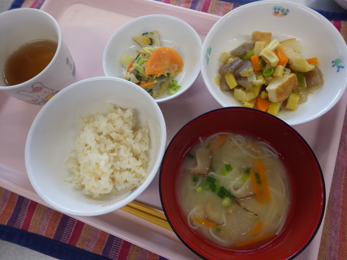 お昼ごはんが、もち麦六分づきご飯・五目煮・練りごまさらだ・そうめんみそ汁。