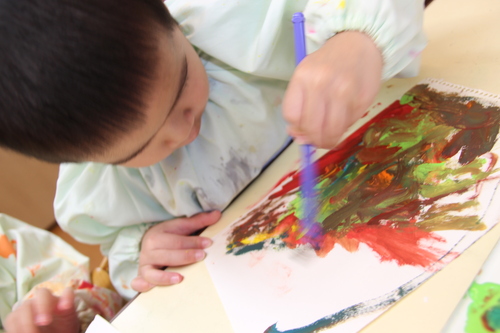 自分の好きな色を選んで画用紙に塗る事を楽しんだり、水をつけて筆の流れを楽しんだり、隙間なく色を重ねる事を楽しんだり… アートの時間を夢中に過ごしました♪