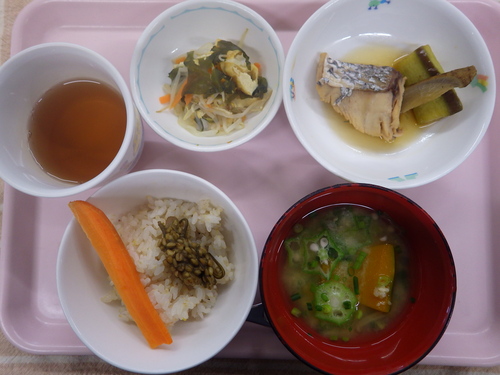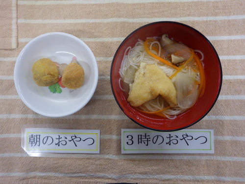 本日のメニューは・・・ 朝のおやつが、さつま芋ときな粉だんご。 お昼のごはんが、 雑穀一分づきご飯 お魚(にべ)の煮つけ わかめの酢の物 おからのみそ汁。 3時のおやつが、きつねそうめん。