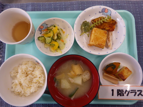 今日の唐揚げは、にんにく醤油の味がジュワ~っと染みていて、高野豆腐が鶏肉のようでした!!