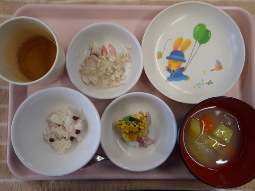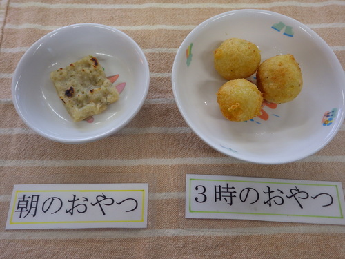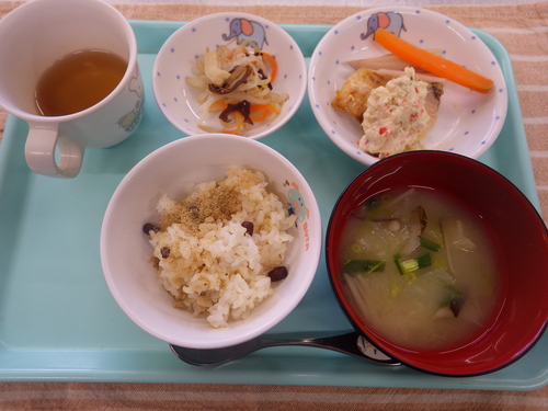 本日のメニューは・・・ 朝のおやつが、れんこんもち。 お昼のごはんが、 あずき一分づきご飯 お魚(シイラ)のムニエル、タルタルがけ もやしときくらげのおひたし きゃべつのみそ汁。 3時のおやつが、大豆とお芋ボール。