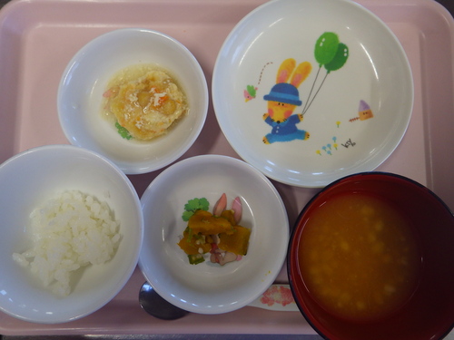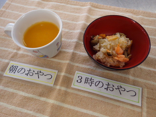 本日のメニューは・・・ 朝のおやつが、雑穀人参ぽたーじゅ。 お昼のごはんが、 赤米一分づきご飯 お野菜がんもどき かぼちゃさらだ 納豆 冬瓜のみそ汁。 3時のおやつは、鮭ときのこごはん。
