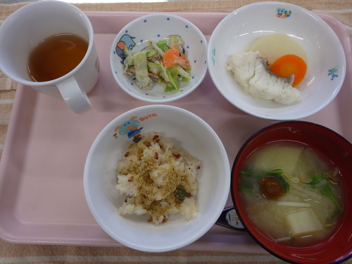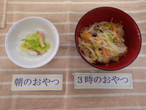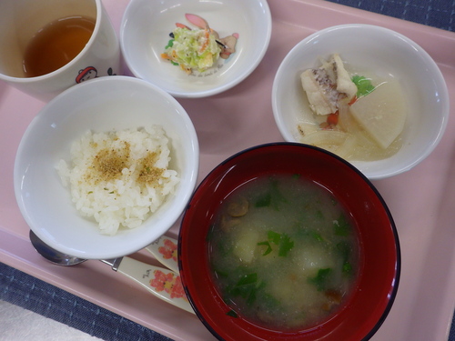 今日のメニューは・・・ 朝のおやつが、ごま和え。 お昼のごはんが、赤米一分づきご飯 お魚と大根のセイロ蒸し れんこん豆腐マヨ・じゃがいものみそ汁。 3時のおやつが、焼きビーフン。
