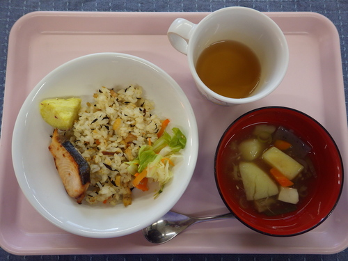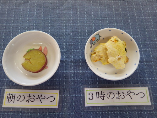 今日のメニューは・・・ 朝のおやつが、さつま芋の甘煮。 お昼のご飯が、ひじきご飯 お魚の塩麴焼き・温野菜・具だくさんのっぺい汁。 3時のおやつが、野菜スコーン。 明日の運動会を頑張るために、たくさん食べるぞ!と 子どもたち。「ご飯を食べると力が出るんだよ!」と やる気満々の様子でした。