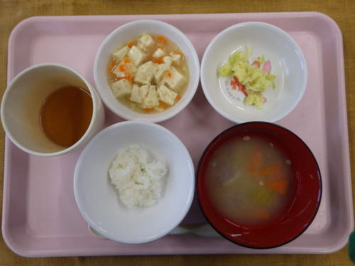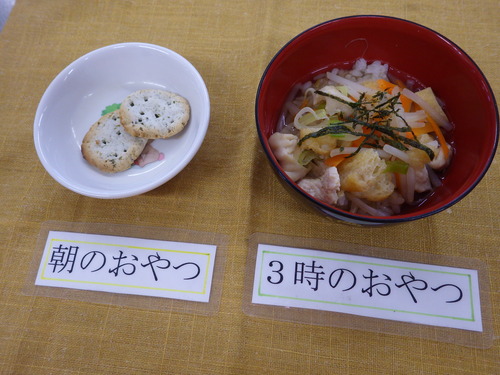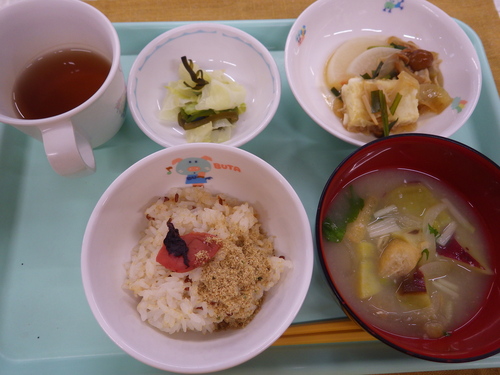 本日のメニューは・・・ 朝のおやつが、海苔のりクッキー。 お昼のご飯が、 赤米一分づきご飯 豆腐すてーき甘辛ダレ きゃべつ昆布のドレッシング和え さつま芋とあげのみそ汁。 3時のおやつが、鶏飯(けいはん)。