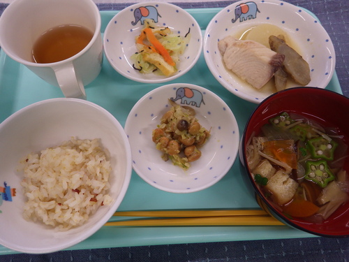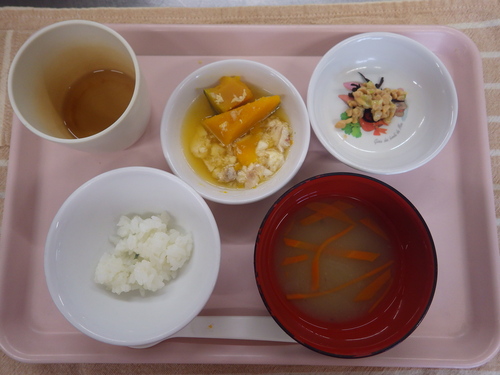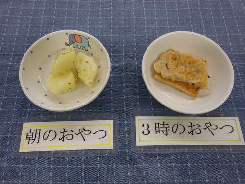 本日のメニューは・・・ 朝のおやつが、粉ふき芋。 お昼のご飯が、 お魚のみそ生姜煮 ごま塩さらだ きのこ納豆 すまし汁。 3時のおやつが、れんこんもち。