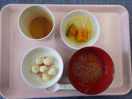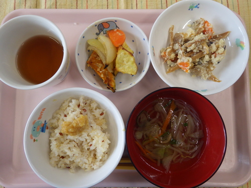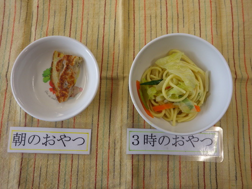 本日のメニューは・・・ 朝のおやつが、さつま芋ガレット。 お昼のご飯が、 赤米一分づきご飯 うの花 焼き野菜胡麻みそ 春雨すーぷ。 3時のおやつが、塩焼きそば。