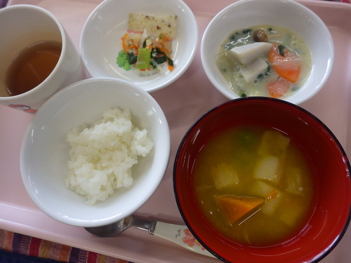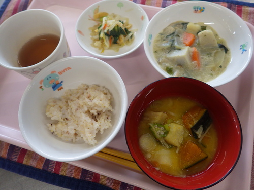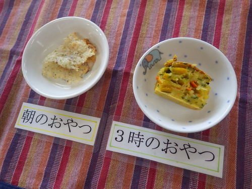 今日のメニューは・・・ 朝のおやつが、ごはんせんべい。 お昼のご飯が、黒米一分づきご飯 豆乳クリーム煮・チンゲン菜のおひたし 麩のみそ汁。 3時のおやつが、野菜のケークサレ。 ☆本日より離乳食の展示を再開しました。