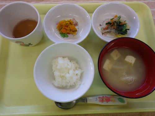 今日のメニューは・・・ 朝のおやつが、米粉の焼きけーき。 お昼のご飯が、白ご飯・春雨チャンプルー・ かぼちゃサラダ・豆腐のみそ汁。 3時のおやつが、さつまいもかりんとう・手作り甘酒・ 果物(1階:みかん・2階:キウイ)。