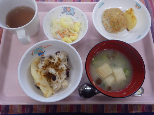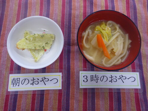 今日のメニューは・・・ 朝のおやつが、さつまいもスティック。 お昼のご飯が、あずき一分づきご飯 れんこんバーグ・マカロニさらだ・麩のみそ汁。 3時のおやつが、みそ煮込みうどん。