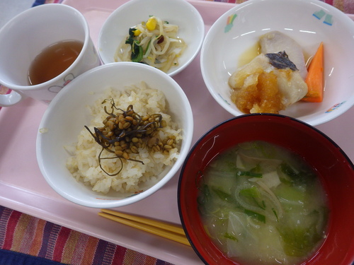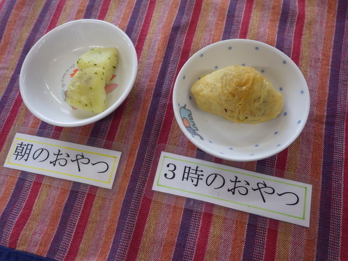 本日のメニューは・・・ 朝のおやつが、粉ふき芋。 お昼のご飯が、 もち麦一分づきご飯 お魚(にべ)の塩焼き、おろしがけ もやしときくらげのおひたし きゃべつのみそ汁。 3時のおやつが、カレー味おいなりさん。