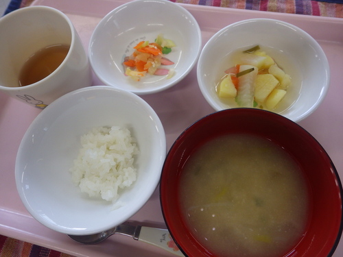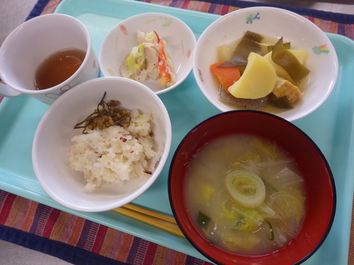 本日のメニューは・・・ 朝のおやつが、ごま和え。 お昼のご飯が、 雑穀一分づきご飯 おでん風煮 れんこんマヨサラダ もやしのみそ汁。 3時のおやつが、黒糖蒸しぱん・いりこ。