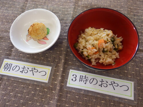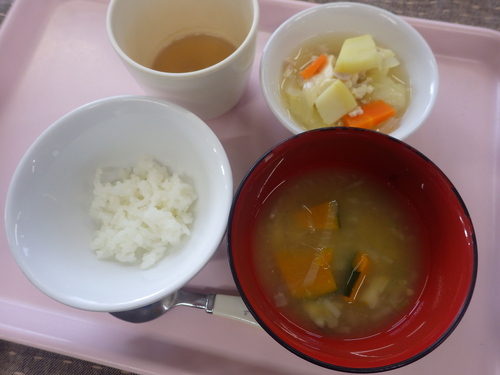 本日のメニューは・・・ 朝のおやつが、きな粉大豆。 お昼のご飯が、 白米(大関米) 豚肉と炒り豆腐 梅みそ和え かぼちゃのみそ汁。 3時のおやつが、鮭わかめごはん。
