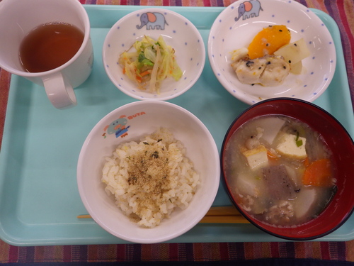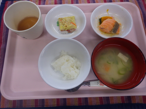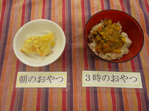 今日のメニューは・・・ 朝のおやつが、がね焼き。 お昼のご飯が、もちきび一分づきご飯 お魚のごまみそ焼き・きゃべつのおかか和え・豚汁。 3時のおやつが、ベジミートのドライカレー。
