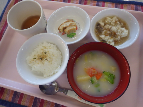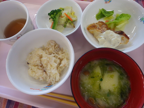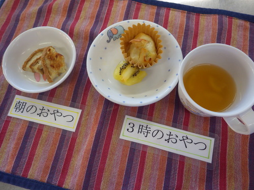 今日のメニューは・・・ 朝のおやつが、麩レンチトースト。 お昼のご飯が、黒米一分づきご飯 お魚のムニエル、タルタルがけ、ブロッコリー練りごまサラダ あおさのみそ汁。 3時のおやつが、米粉マフィン・れもんティー。