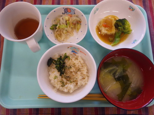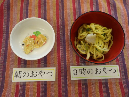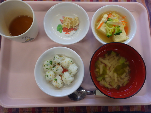 今日のメニューは・・・ 朝のおやつが、きらずやき。 お昼のご飯が、もち麦一分づきご飯 豆腐すてーき、カレー風味 春雨サラダ・わかめのみそ汁。 3時のおやつが、里芋とバジルの豆乳ぱすた。