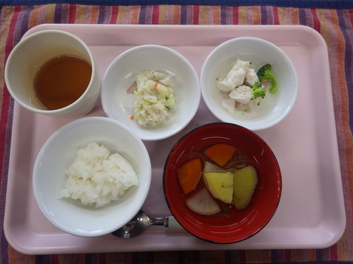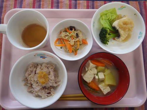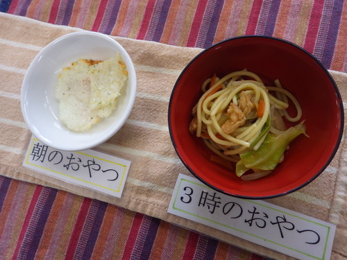 本日のメニューは・・・ 朝のおやつが、ごはんせんべい。 お昼のご飯が、 黒米一分づきご飯 お魚(さわら)のおろし煮 れんこんときくらげのきんぴら さつま汁。 3時のおやつが、焼きそば。