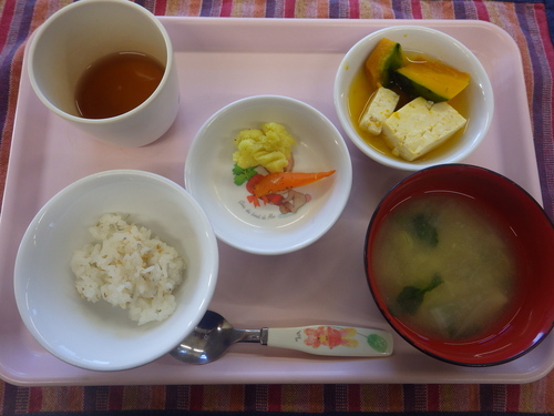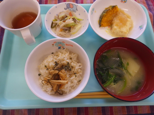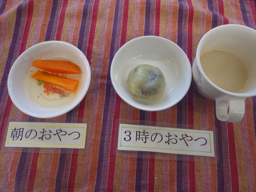 本日のメニューは・・・ 朝のおやつが、にんじん甘煮。 お昼のご飯が、 もちあわ一分づきご飯 焼き豆腐とかぼちゃのおろしがけ きのこと昆布のさらだ ほうれん草のみそ汁。 3時のおやつが、いきなり団子・手作り甘酒。