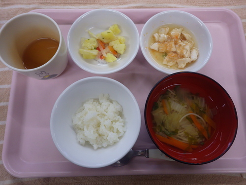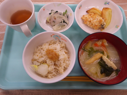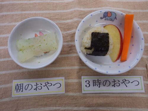 本日のメニューは・・・ 朝のおやつが、大根スティック。 お昼のご飯が、 もち麦一分づきご飯 お魚(さわら)のパン粉焼き 練りごまさらだ そうめんみそ汁。 3時のおやつが、おむすび・漬物・りんご。