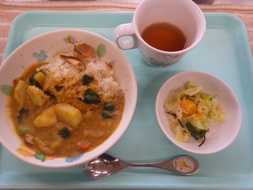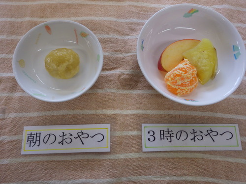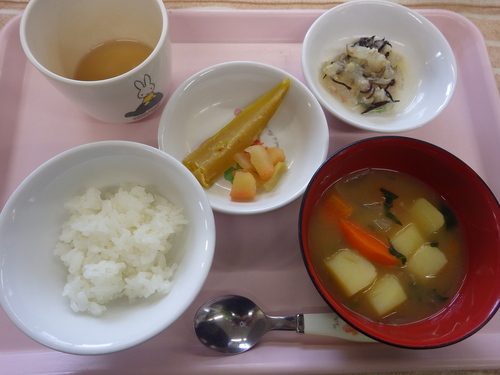 本日のメニューは・・・ 朝のおやつが、ソーダまんじゅう。 お昼のご飯が、 押麦一分づきご飯 和風ダシ奄美カレー おからと野菜さらだ。 3時のおやつが、ふかし芋・みかん・りんご。