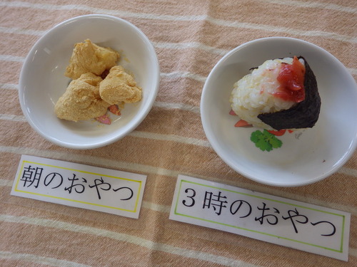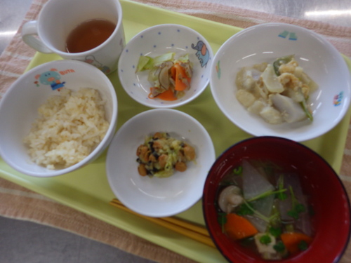 今日のメニューは・・・ 朝のおやつが、豆乳くずもち。 お昼のご飯が、もちあわ一分づきご飯・ねぎ塩炒め ごま豆乳和え・海苔納豆・けんちん汁。 3時のおやつが、梅おむすび。