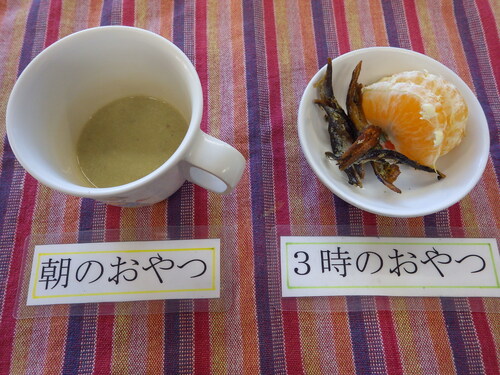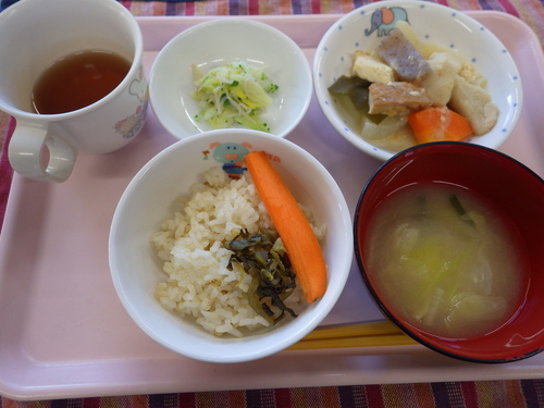 今日のメニューは・・・ 朝のおやつが、豆乳ぽたーじゅ。 お昼のご飯が、もち麦一分づきご飯 おでん風煮・じゃこサラダ・おみそ汁。 3時のおやつが、カリカリいりこ・でこぽん。 今日は、あったかおでん風煮でした。 大根・里芋・人参・厚揚げ・昆布・こんにゃくと 味がしみしみで美味しかったですよ!