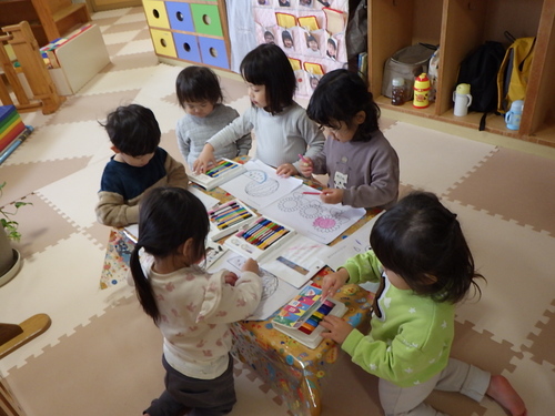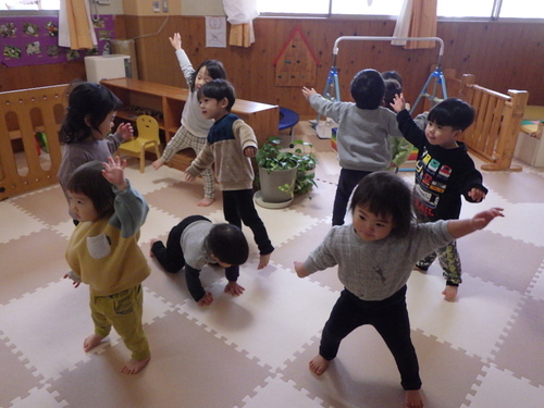 お外で遊んでいたときにバッタを見つけ楽し気にみんなで追いかける姿があり、なんだか春の陽気だね~と言っているそばから冷え込んで鼻水が出ている子供・・体調を崩しやすくなるのでお部屋でも体操をしたりして、体の中からポカポカして風邪を吹き飛ばせるよう頑張りました~