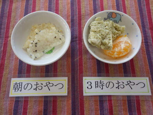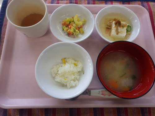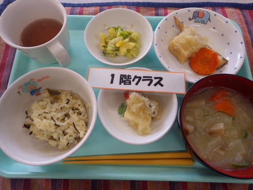 今日のメニューは・・・ 朝のおやつが、ごはんせんべい。 お昼のご飯が、高菜ご飯・揚げ出し豆腐 おかか和え・きのこ春雨みそ汁。 3時のおやつが、バジル焼きけーき・でこぽん。