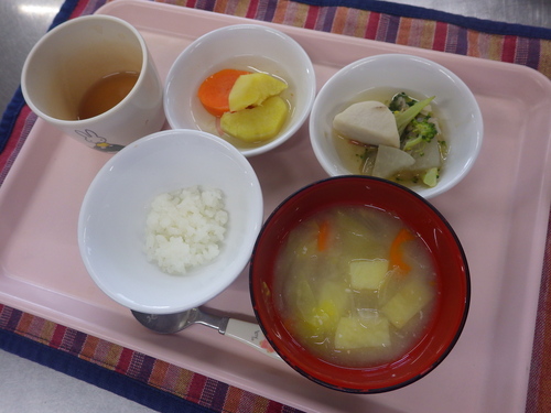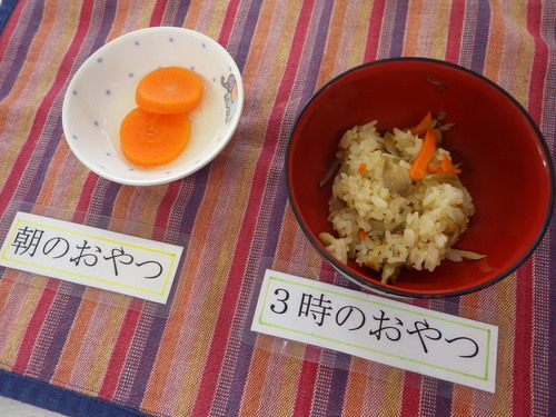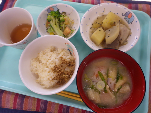 本日のメニューは・・・ 朝のおやつが、人参の甘煮。 お昼のご飯が、 もち麦一分づきご飯 里芋のごま煮 ブロッコリーの昆布和え うすあげのみそ汁。 3時のおやつが、鶏ごぼうごはん。