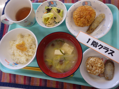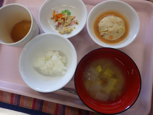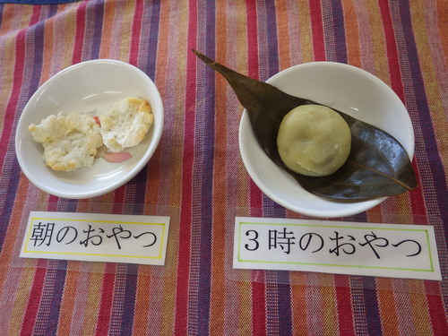 本日のメニューは・・・ 朝のおやつが、ごはんクッキー。 お昼のご飯が、 押麦一分づきご飯 魚ろっけ 磯和え 白菜のみそ汁。 3時のおやつが、ニッケ団子。
