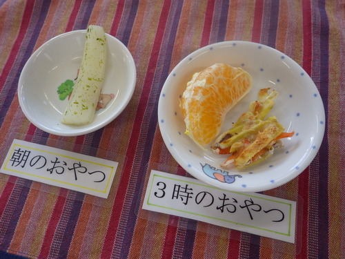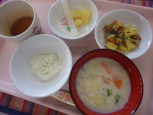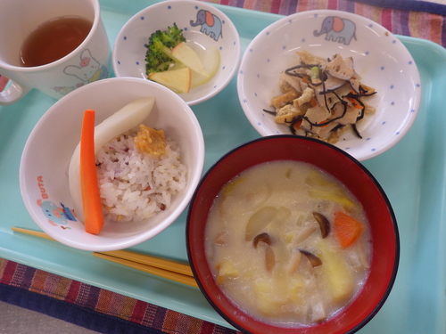 本日のメニューは・・・ 朝のおやつが、野菜スティック(大根)。 お昼のご飯が、 雑穀一分づきご飯 豆乳しちゅー ひじき煮 りんごサラダ。 3時のおやつが、がね焼き・でこぽん。 今日は豆乳しちゅーでした。 冬と言ったらシチューのイメージがしますね(^^♪ ”バサ”という白身のお魚も入れてダシが出て、さらに美味しくなりました。 白菜もトロトロで口に入れるととろけました(^^♪