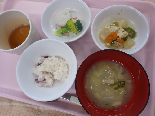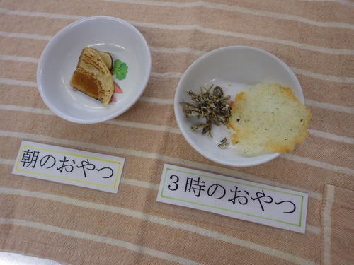 今日のメニューは・・・ 朝のおやつが、焼きだご。 お昼のご飯が、あずき一分づきご飯 炒り豆腐・ごまみそ和え・きのこのお吸い物。 3時のおやつが、ごはんせんべい・田作り。
