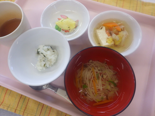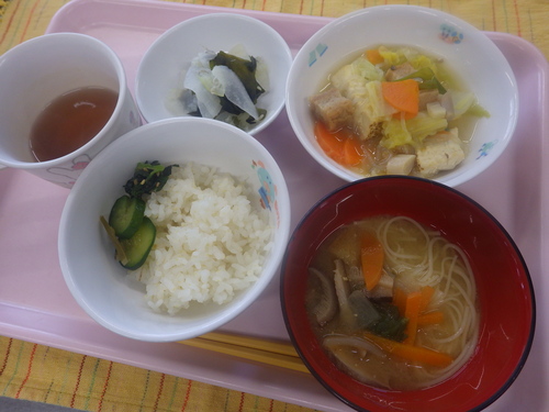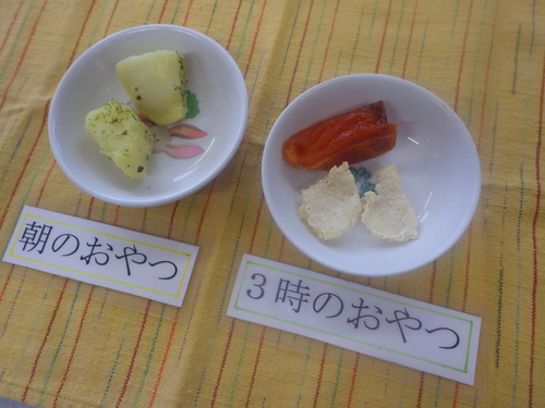 今日のメニューは・・・ 朝のおやつが、粉ふきじゃが。 お昼のご飯が、黒米一分づきご飯 車麩のすき焼き風煮・わかめと大根の酢の物・そうめんみそ汁。 3時のおやつが、きらずやき・干し柿。 今日は、みんな大好き「そうめんみそ汁」。 そうめんのおかわりがたりないくらいに あっという間に無くなっちゃいます。 今日も、たくさん食べていた子どもたちでした。