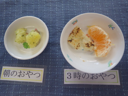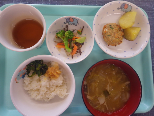今日のメニューは・・・ 朝のおやつが、粉ふき芋。 お昼のご飯が、もち麦一分づきご飯 ハンバーグおろし大根 れんこんとブロッコリーごまサラダ きのこのみそ汁。 3時のおやつが、大根もち・でこぽん。