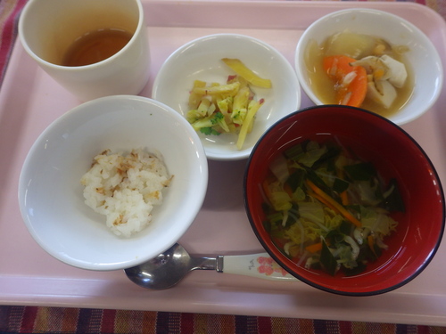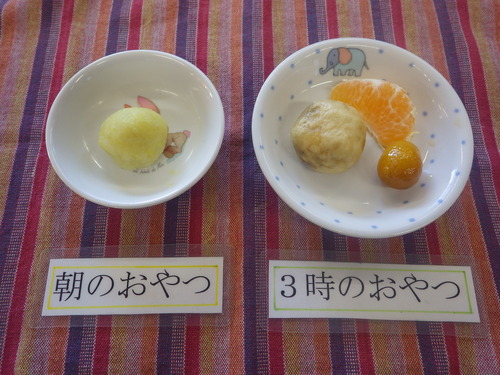 今日のメニューは・・・ 朝のおやつが、さつま芋のごはんおはぎ。 お昼のご飯が、もちきび一分づきご飯 お魚と野菜西京焼き コロコロサラダ 冬野菜のみそ汁。 3時のおやつが、黒糖まんじゅう・きんかんの甘煮・でこぽん。