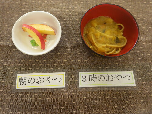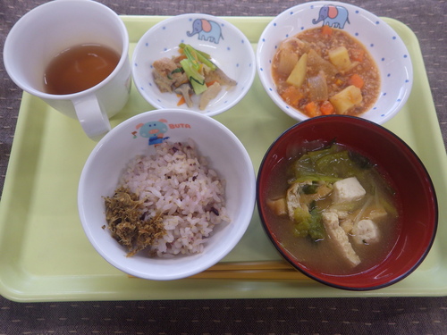 今日のメニューは・・・ 朝のおやつが、りんご。 お昼のご飯が、黒米一分づきご飯 ぽーくびーんず 切干大根煮 えのきのみそ汁。 3時のおやつが、和風カレーうどん。 ☆離乳食はお休みでした。