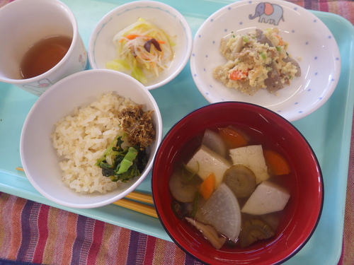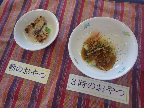 本日のメニューは・・・ 朝のおやつが、黒豆せんべい。 お昼のご飯が、 もちあわ一分づきご飯 春雨中華風さらだ のっぺい汁。 3時のおやつが、玄米と野菜お好み焼き。 ※離乳食はお休みです。 ☆あおぐみさんは、袋小学校にて、給食でした(^^♪