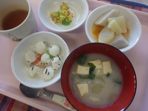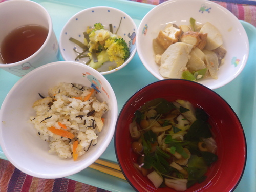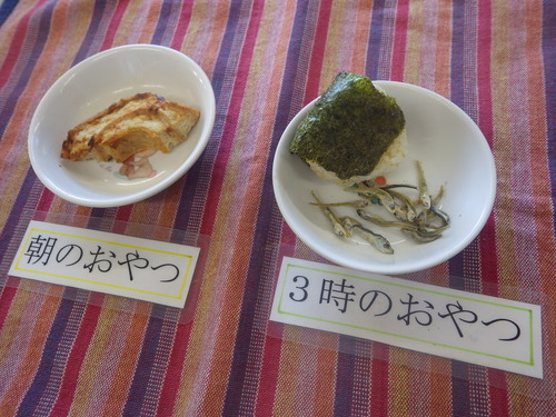 本日のメニューは・・・ 朝のおやつが、麩レンチトースト。 お昼のご飯が、 ひじきじゃこご飯 厚揚げと里芋の胡麻みそ炒め 白菜と昆布のさらだ すまし汁。 3時のおやつが、おむすび・カリカリいりこ。