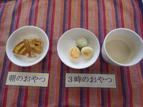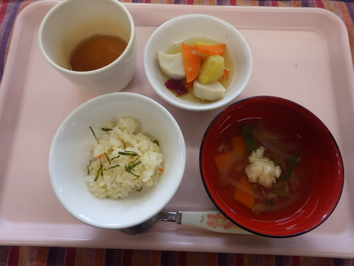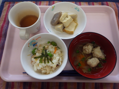 今日のメニューは・・・ 朝のおやつが、車麩スパイシーカレー。 お昼のご飯が、ひなちらし寿司 甘辛煮・つみれ汁。 3時のおやつが、3色だんご・手作り甘酒。