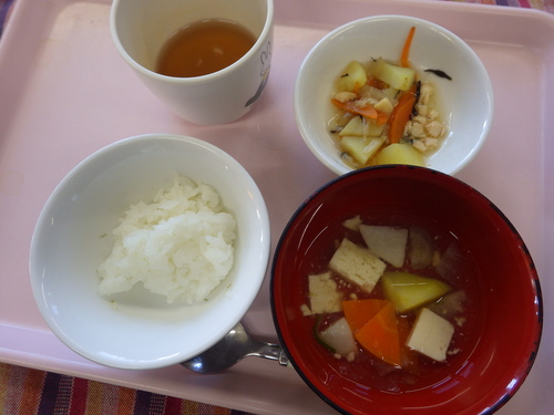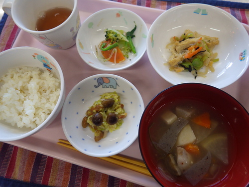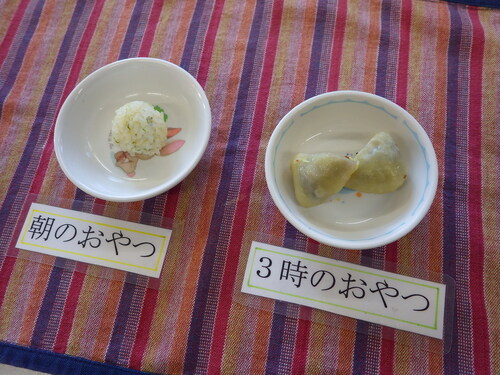 今日のメニューは・・・ 朝のおやつが、おにぎりボール。 お昼のご飯が、もち麦一分づきご飯 ひじき煮 オリーブさらだ きのこ納豆 のっぺい汁。 3時のおやつが、いきなり団子。
