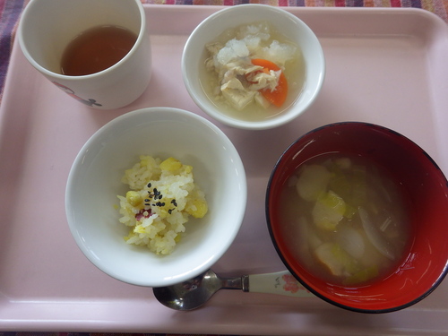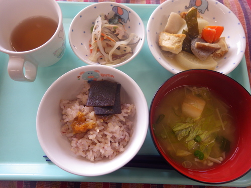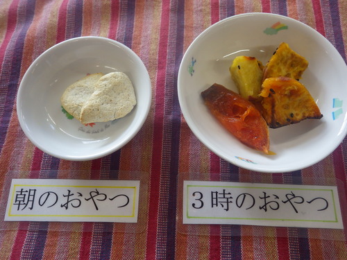 本日のメニューは・・・ 朝のおやつが、米粉スコーン。 お昼のご飯が、 黒米一分づきご飯 おでん風煮 れんこんナムル レタスとえのきのみそ汁。 3時のおやつが、焼き大学芋・干し柿。