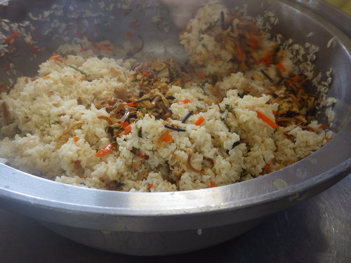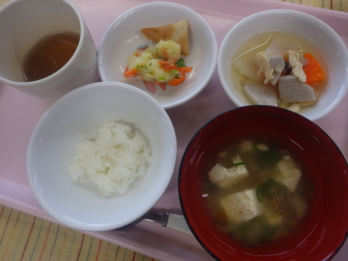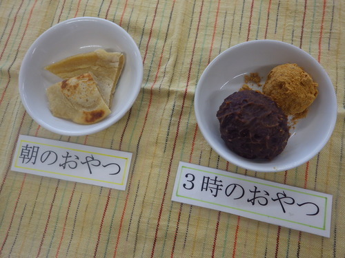 本日のメニューは・・・ 朝のおやつが、焼きだご。 お昼のご飯が、 春の混ぜごはん 筑前煮 白菜ごまドレッシングサラダ さら玉のみそ汁。 3時のおやつが、桜入りあんのおはぎ。