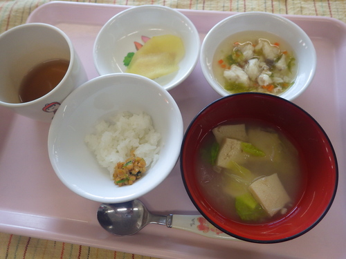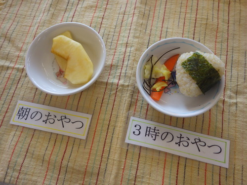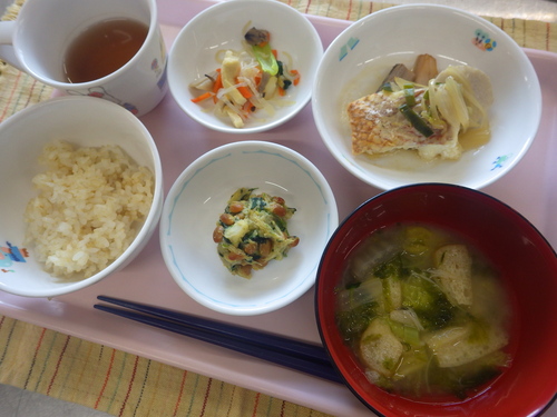 今日のメニューは・・・ 朝のおやつが、りんご。 お昼のご飯が、もち麦一分づきご飯 お魚のムニエル、薬味ソース 大根のきんぴら・ほうれん草納豆・白菜のみそ汁。 3時のおやつが、おむすび・ぬか漬け。