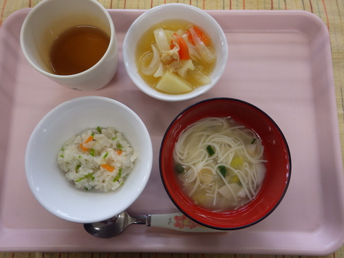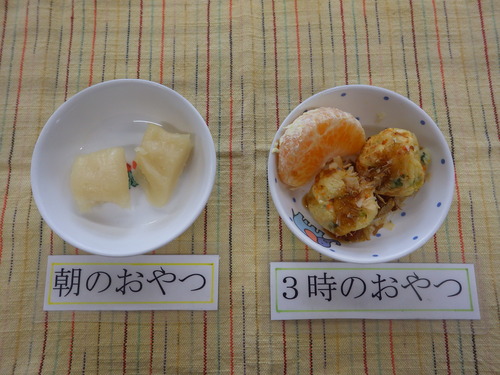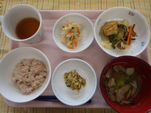 本日のメニューは・・・ 朝のおやつが、米粉蒸しパン。 お昼のご飯が、 黒米一分づきご飯 春野菜のみそ炒め ささみとさら玉の酢の物 ひじき納豆 きのこのすまし汁。 3時のおやつが、じゃが芋のたこ焼き風・でこぽん。