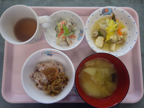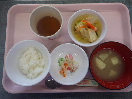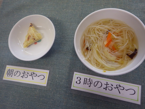 今日のメニューは・・・ 朝のおやつが、さつま芋ガレット。 お昼のご飯が、雑穀一分づきご飯・すき焼き風煮・ 豆腐マヨさらだ・じゃが芋のみそ汁。 3時のおやつが、ビーフンスープ。